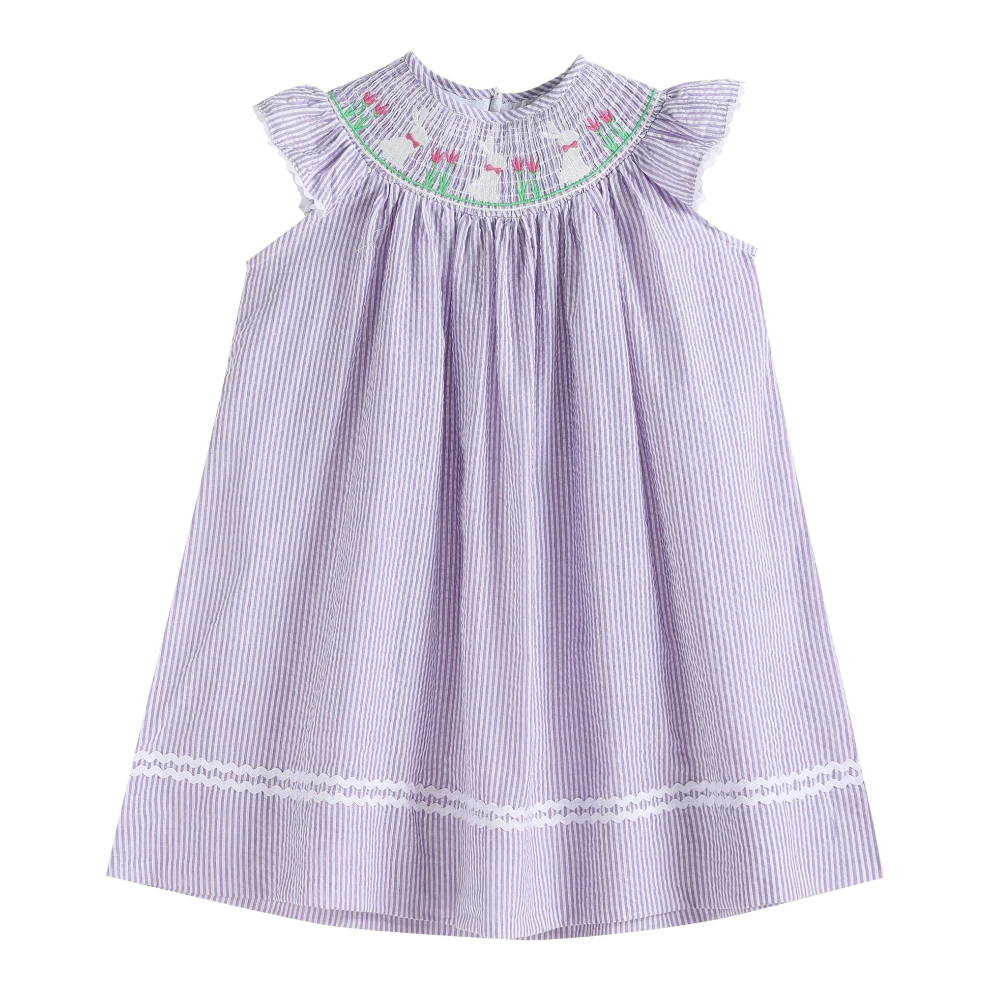 Charming and cute! Your little cuties closet is not complete without this adorable light purple seersucker Easter Bunny smocked bishop dress. They will love spending their days in this outfit made out of 100% soft cotton. Cute details make it a one of a kind addition to their closet. From days at the park or just fun days at home your little sweetie will be ready and picture perfect!